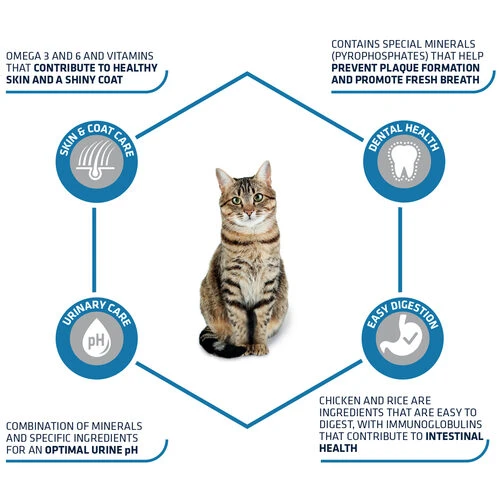 Advance Adult Huhn und Reis unterstĂŒtzt das Immunsystem der Katze und sorgt dank des leicht verdaulichen Huhns und Reises fĂŒr eine gute Darmfunktion. Omega 3 und 6 tragen zur Erhaltung einer gesunden Haut und eines gesunden Fells bei. Spezielle Mineralien helfen, Plaque zu verhindern. Sehr wirksam sind auch die Mineralien und Inhaltsstoffe, die zu einem optimalen pH-Wert im Urin beitragen.