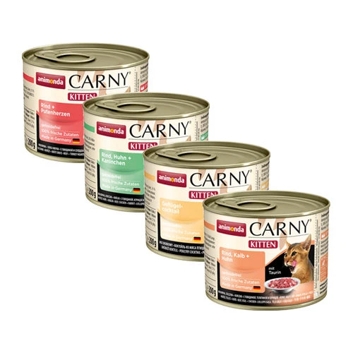 - Animonda Carny Kitten – GeflĂĽgelcocktail: 39 % Rind (Lungen, Herz, Fleisch, Nieren, Euter), 14 % HĂĽhnchenleber, 6 % Putenherzen, 6 % Entenherzen und Calciumcarbonat.