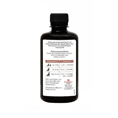 Damit alle Feststoffe gelöst werden, bitte 30 Sekunden lang kräftig schüttelnFalls Ihr Tier bisher keine Öl-Zugabe erhalten hat, sollte die tägliche Menge über eine Woche bis zur empfohlenen Tagesmenge gesteigert werden.