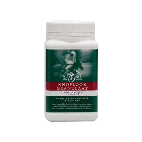 Das Grand National Knoblauchgranulat unterstĂŒtzt die AbwehrkrĂ€fte und die Verdauung von Ihrem Pferd oder Pony. Das Granulat ist angefĂŒllt mit Schwefel, Vitaminen und Allicin, das ein im Knoblauch enthaltenes Antibiotikum ist. Diese Wirkstoffe fördern die Verdauung. Zudem hat das Knoblauchgranulat eine Insekten abwehrende Wirkung. Ein Topf enthĂ€lt 800 Gramm.